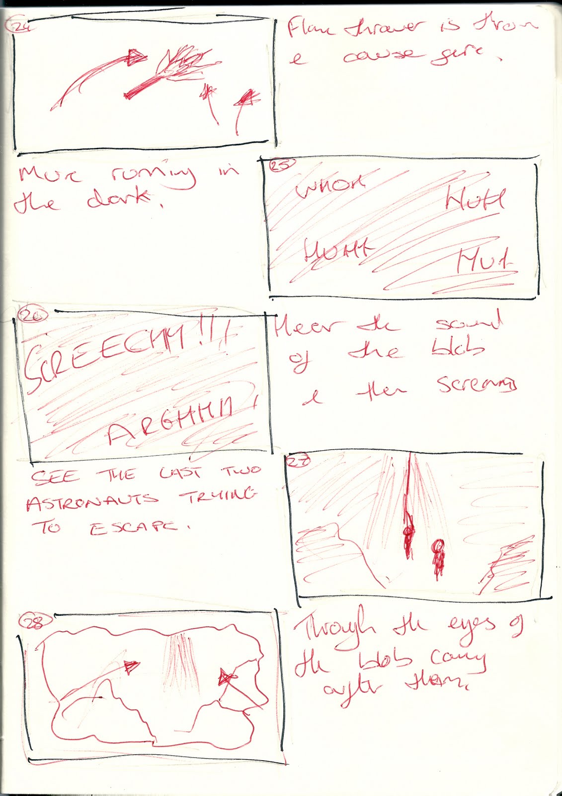 Cool, I can understand wht's going on, and can read the text fine. I'll start working on finalising the script now that we've got a storyboard. However, I dunno if we decided on this in the meeting, but at the end of the trailer, you've got the two leaving the hole, did we decide on putting that in, cus that's basically the whole film. I thought the trailer was gonna start outside of the hole (which it does), but then I thought it'd end inside the hole, and the last scene being the blob attacking the camera.